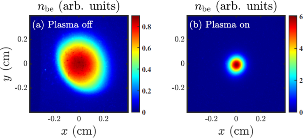 實(shí)驗中,基于高能電子成像實(shí)驗平臺,科研人員利用熱陰極微波電子槍產(chǎn)生的電子束及高壓直流放電等離子體靶,成功觀(guān)察到電子束在有源等離子體透鏡中的聚焦現象,同時(shí)對其聚焦原理深入分析。實(shí)驗結果表明(圖1):當等離子體靶不放電時(shí),YAG屏上的束斑為1.25 mm,而該靶調節至合適的放電電壓和氣壓后,束斑減小至0.48mm,聚焦效果顯著(zhù)!