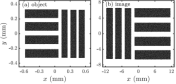鑒于有源等離子體透鏡具有緊湊、聚焦梯度大、對稱(chēng)聚焦、色差小的優(yōu)勢,科研人員將該透鏡成功應用到高能電子成像中。從高能電子束在透鏡中的傳輸矩陣出發(fā),科研人員設計了一個(gè)總長(cháng)為44.87cm、放大倍數為20的高能電子成像系統,其點(diǎn)對點(diǎn)成像模擬結果如圖2所示。模擬結果表明:該系統的成像分辨率可以達到亞微米量級,相較于基于電磁四極鐵的全長(cháng)為5m(放大倍數為10)的成像系統十分緊湊。