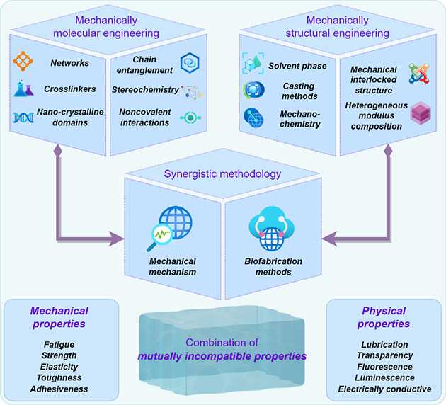 基于力學(xué)調控在分子工程和結構工程的多種調控策略,研究發(fā)現分子和結構尺度的耦合不僅會(huì )獲得極端力學(xué)性能,而且為物理和化學(xué)多種屬性之間的兼容提供了可操縱手段。作者融合凝膠材料的力學(xué)機制和仿生制造方法,提出了“協(xié)同方法學(xué)”(synergistic methodology)的調控思想。在力學(xué)性能方面,協(xié)同方法學(xué)主要是指將分子工程和結構工程的各種調控策略完美地集成在同一體材料中,實(shí)現不同力學(xué)屬性之間的權衡,尤其在強度、韌性、彈性、疲勞、黏附等;在凝膠功能方面,協(xié)同方法學(xué)主要指實(shí)現力學(xué)性質(zhì)與電學(xué)、光學(xué)、生物摩擦學(xué)等性質(zhì)之間的兼容。聚合物凝膠構筑協(xié)同方法學(xué)從材料性能和功能兩個(gè)調控視角出發(fā),為解決材料互不相容性質(zhì)之間的沖突提供了新思路,對設計制備具有優(yōu)異性能與特殊功能的新型聚合物凝膠材料具有重要的參考價(jià)值和理論指導作用。