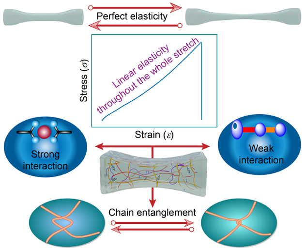 近二十年,聚合物凝膠,尤其是水凝膠,其力學(xué)強度、韌性、疲勞和黏附等性質(zhì)的調控和提升已取得巨大進(jìn)步,體現在先進(jìn)的力學(xué)機制和構造方法。然而,在力學(xué)強度和完美彈性之間尋求權衡仍是一個(gè)挑戰。