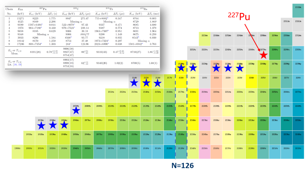 圖:實(shí)驗觀(guān)測到的9個(gè)新核素钚-227的α衰變事件以及钚-227在核素圖上的位置(紅色五星)。藍色五星標記的是近代物理所團隊此前合成的部分新核素。(圖/楊華彬)