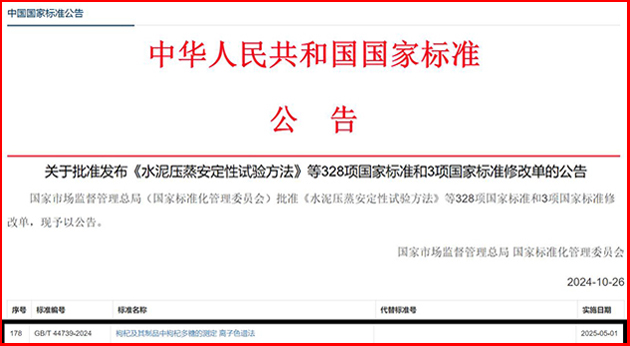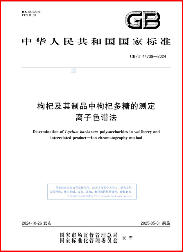 該團隊自2019年起,以枸杞多糖為研究對象,開(kāi)展了枸杞多糖含量分析新方法的研究和國家標準的制訂。10月26日,由蘭州化物所牽頭、寧夏回族自治區藥品檢驗研究院等單位參與制訂的國家標準《枸杞及其制品中枸杞多糖的測定 離子色譜法》(GB/T 44739-2024),由國家市場(chǎng)監督管理總局(國家標準化管理委員會(huì ))批準發(fā)布,將于2025年5月1日正式實(shí)施。