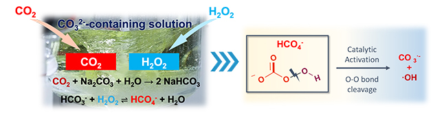 圖1. CO2同H2O2、CO32-間自發(fā)串聯(lián)反應衍生HCO4-構建的原位氧化體系。