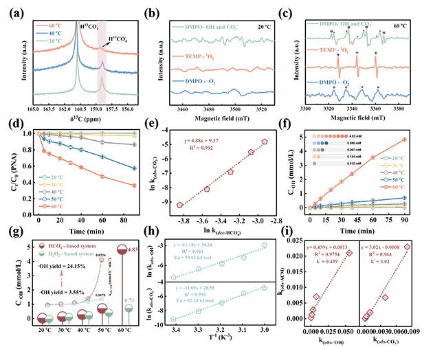 圖2.(a-e)CO2衍生HCO4-的生成轉化;(f,g)·OH的定量分析;(h,i)選擇性活化HCO4-生成·OH和CO3·-的相關(guān)性研究。