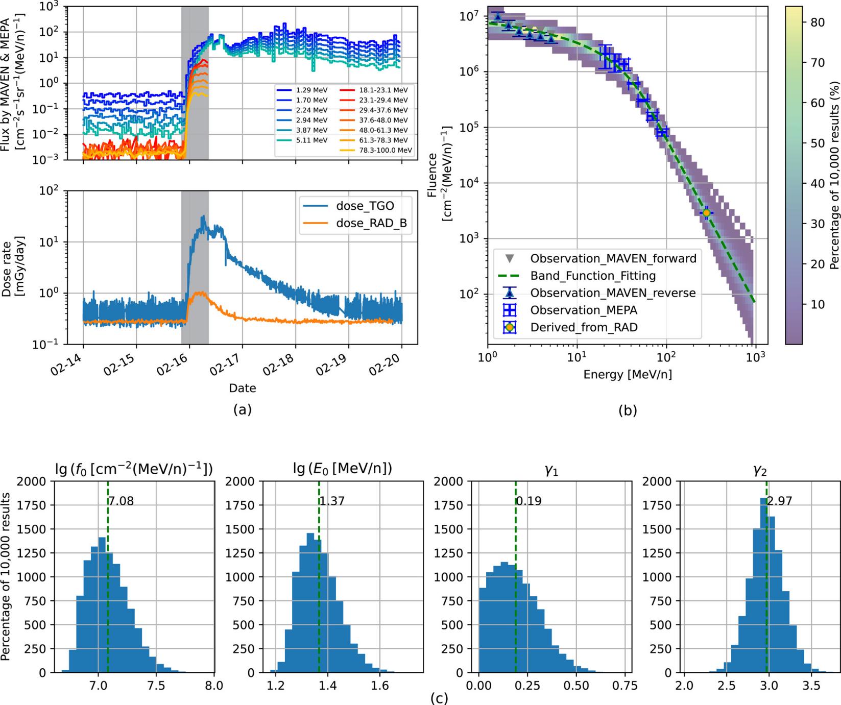 本研究使用了多個(gè)探測器數據來(lái)構建相關(guān)質(zhì)子能譜。中低能段的質(zhì)子能譜由能量粒子分析儀和美國高能粒子儀提供。更高能段的質(zhì)子通量是團隊結合火星表面的輻射評估探測器和火星粒子傳輸模型模擬反演得到。研究團隊通過(guò)對上述觀(guān)測和反演的能譜進(jìn)行擬合,得到了此次太陽(yáng)高能粒子事件在火星空間1~1000MeV能量范圍內的完整質(zhì)子能譜。