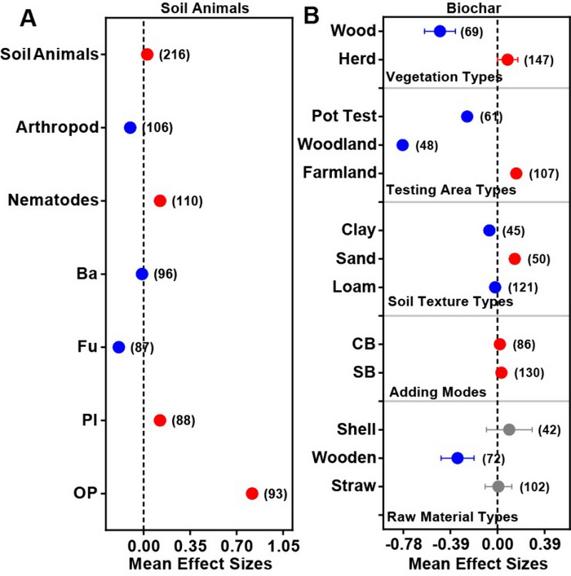 近年來(lái),全球范圍內對生物炭作為土壤調節劑的應用興趣顯著(zhù)增加。土壤動(dòng)物在土壤生態(tài)系統中種類(lèi)繁多,并對土壤環(huán)境的變化表現出高度敏感性。它們在評估不同田間管理條件和土地利用狀況下的土壤健康方面發(fā)揮著(zhù)至關(guān)重要的作用。生物炭對土壤動(dòng)物的影響既包括土壤動(dòng)物的直接取食作用,也涉及生物炭對土壤環(huán)境的間接影響。然而,目前尚缺乏關(guān)于生物炭添加對土壤動(dòng)物影響的系統性和定量性研究。薈萃分析能夠促進(jìn)對已有研究結果的定量整合,通過(guò)整合多個(gè)發(fā)現,尤其是在特定主題下樣本量相對較小的情況下,可以提高統計效率,解決研究結果間的不一致性,探討現有文獻中的發(fā)表偏差,制定新的研究問(wèn)題,并為進(jìn)一步分析研究提供理論性框架和標準化體系。