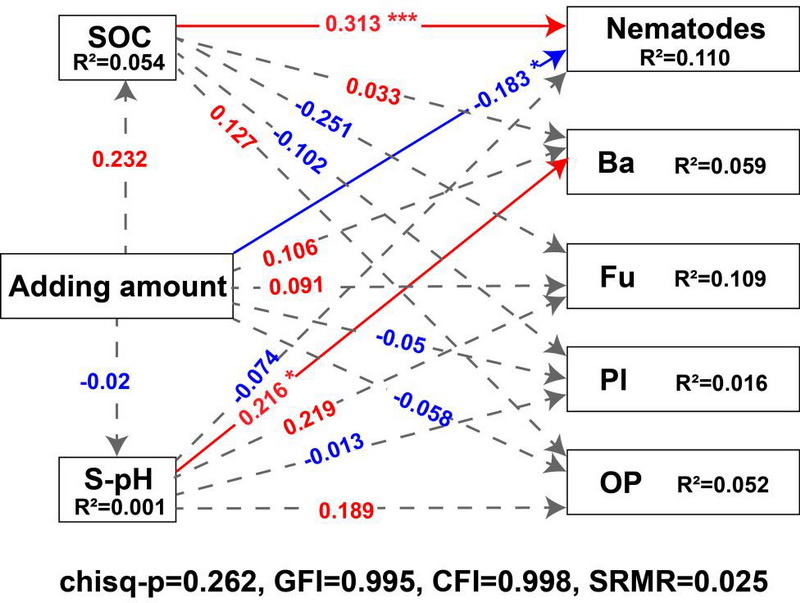 中國科學(xué)院西北高原生物研究所高寒濕地生態(tài)系統近自然修復與功能提升研究團隊開(kāi)展了一項薈萃分析,旨在研究生物炭添加對不同處理和實(shí)驗條件下土壤動(dòng)物的影響。結果表明:(1)生物炭的添加顯著(zhù)增加了土壤動(dòng)物的豐度(0.027),并改變了其群落結構;(2)生物炭促進(jìn)了土壤線(xiàn)蟲(chóng)的豐度(0.124),而抑制了土壤節肢動(dòng)物的豐度(?0.101);(3)生物炭通過(guò)直接和間接途徑影響土壤動(dòng)物的豐度,其中最顯著(zhù)的途徑是由土壤有機碳(SOC)和土壤pH值介導的。生物炭添加的數量和持續時(shí)間對不同線(xiàn)蟲(chóng)物種的豐度產(chǎn)生了不同的影響,最終導致土壤微型食物網(wǎng)結構的改變。