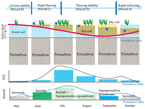 圖1. 多年凍土活動(dòng)層凍融過(guò)程“土壤水-凍土層上水-地表徑流”動(dòng)態(tài)的響應理論框架