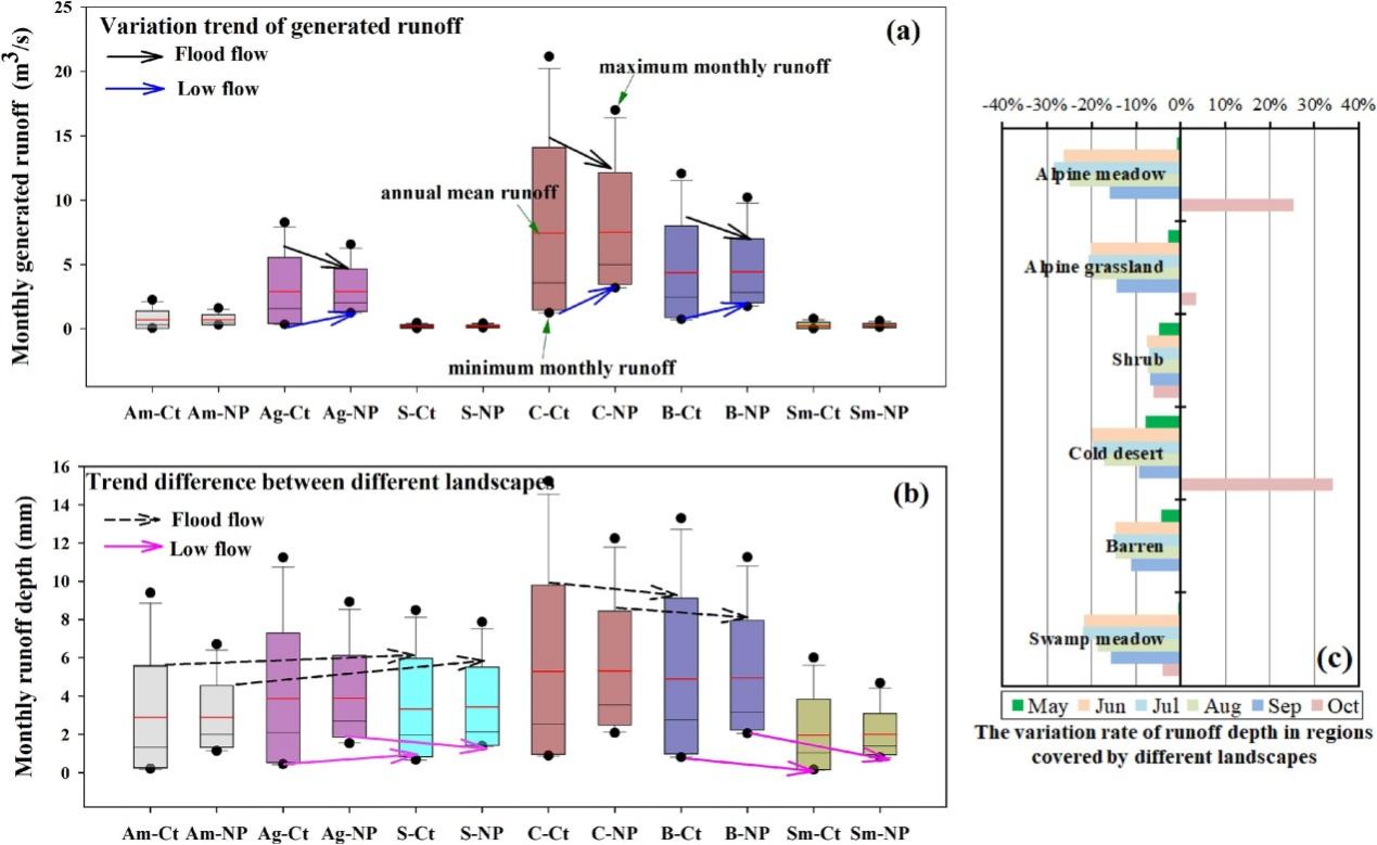 中國科學(xué)院西北生態(tài)環(huán)境資源研究院冰凍圈水文研究團隊基于多站點(diǎn)的長(cháng)期實(shí)測數據分析和模型模擬,量化評估了青藏高原多年凍土流域活動(dòng)層土壤水、凍土層上水以及地表徑流的水文聯(lián)系,并對高寒草甸、高寒草原、寒漠、沼澤草甸等典型凍土下墊面景觀(guān)要素的徑流調節能力及產(chǎn)流貢獻進(jìn)行了評價(jià),闡述了凍土變化對流域產(chǎn)匯流過(guò)程及水源涵養能力的量化影響。