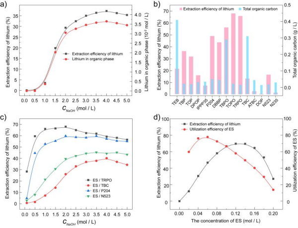 該研究為從堿性溶液中分離鋰提供了一種有效的方法,通過(guò)對ES和TRPO萃取體系的研究,不僅實(shí)現了高Na/Li比例溶液中鋰的高效回收,而且在理論上闡明了萃取過(guò)程的分子機制,為后續萃取劑構效關(guān)系和萃取劑的設計研究提供了理論基礎。