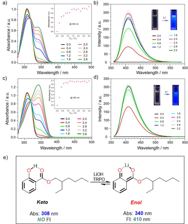 中國科學(xué)院青海鹽湖研究所研究團隊對2-乙基己基水楊酸(ES)和三烷基磷酸氧化物(TRPO)混合萃取體系進(jìn)行了平衡、過(guò)程和機理研究。系統研究了影響鋰萃取的因素,如有機相組成、水相條件、萃取時(shí)間和ES萃取系統的酸堿耐受性。通過(guò)平衡研究,設計了從碳酸鋰母液中回收鋰的整個(gè)過(guò)程,包括萃取、洗滌、剝離和再生,并成功回收了99%的鋰,得到了含25.85 g/L鋰和0.08 g/L鈉的鋰富集溶液。研究表明,萃取過(guò)程是熱力學(xué)自發(fā)的熵增過(guò)程,在分子水平上,通過(guò)紫外-可見(jiàn)光譜(UV–Vis)、熒光光譜(Fl)、核磁共振(1H NMR)和傅里葉變換紅外光譜(FT-IR)闡明了配位機制。