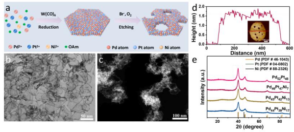 甲醇、乙醇等儲能小分子作為燃料的直接醇類(lèi)燃料電池,具有能量密度高、工作溫度低、環(huán)境友好、燃料儲存和填充方便等優(yōu)點(diǎn)。電催化劑作為電催化反應的核心,對提高燃料電池的效率起著(zhù)重要作用。然而,目前開(kāi)發(fā)的催化劑大多動(dòng)力學(xué)遲緩,并涉及多電子轉移過(guò)程的陽(yáng)極醇氧化反應。以Pt和Pd為代表的鉑族金屬表現出良好的催化效果,但在提高其固有活性和穩定性的同時(shí)還需要進(jìn)一步降低成本。多孔納米結構可進(jìn)一步增加比表面積和孔體積,從而最大限度地提高反應物分子的有效傳質(zhì)能力和納米級電催化劑內的電子遷移率。因此,調控超薄鉑基或鈀基合金的孔隙,有望成為最大化本征催化活性和穩定性的新途徑。