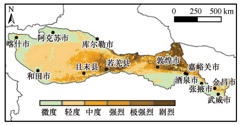結果表明,在研究區總面積80.67萬(wàn)平方公里內,多年平均風(fēng)蝕模數為3553 t·km-2,風(fēng)蝕高值區集中在塔克拉瑪干沙漠東南緣及河西走廊中部??傮w上,由于研究區風(fēng)速下降、植被覆蓋度和降水量增加,風(fēng)蝕模數呈下降趨勢,年代下降速率為41 t·km-2,風(fēng)蝕減少區域占研究區總面積的48%。同期,PM10的多年平均釋放量為3.11×107 t,平均釋放速率為 38.53 t·km-2·a-1。季節性分析表明,春季的風(fēng)蝕模數最高,占年內風(fēng)蝕總量的47%。風(fēng)速、植被覆蓋度和土壤濕度是影響風(fēng)蝕的關(guān)鍵因素,其中風(fēng)速是主要驅動(dòng)因素(R2?。尽?.8)。