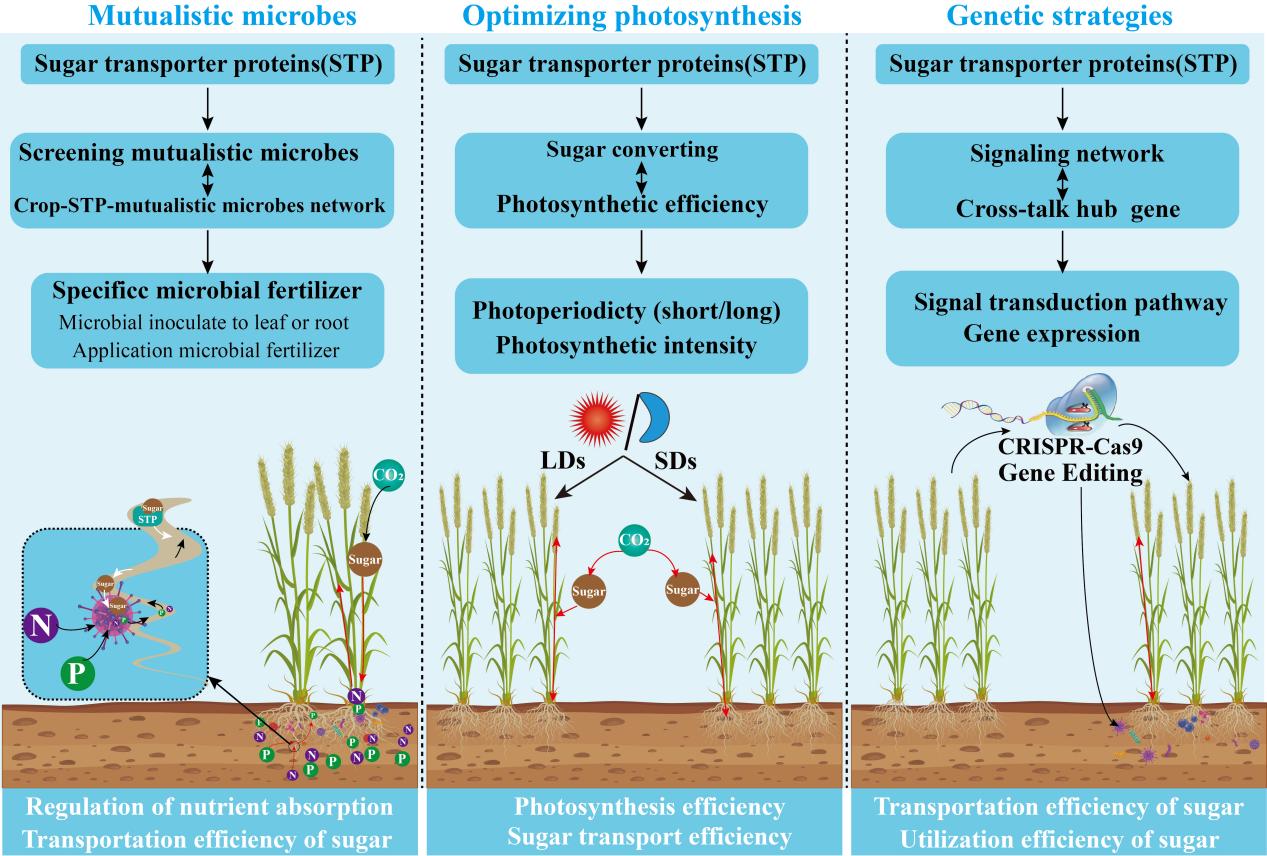 圖4.?通過(guò)糖轉運蛋白提高作物產(chǎn)量的關(guān)鍵策略