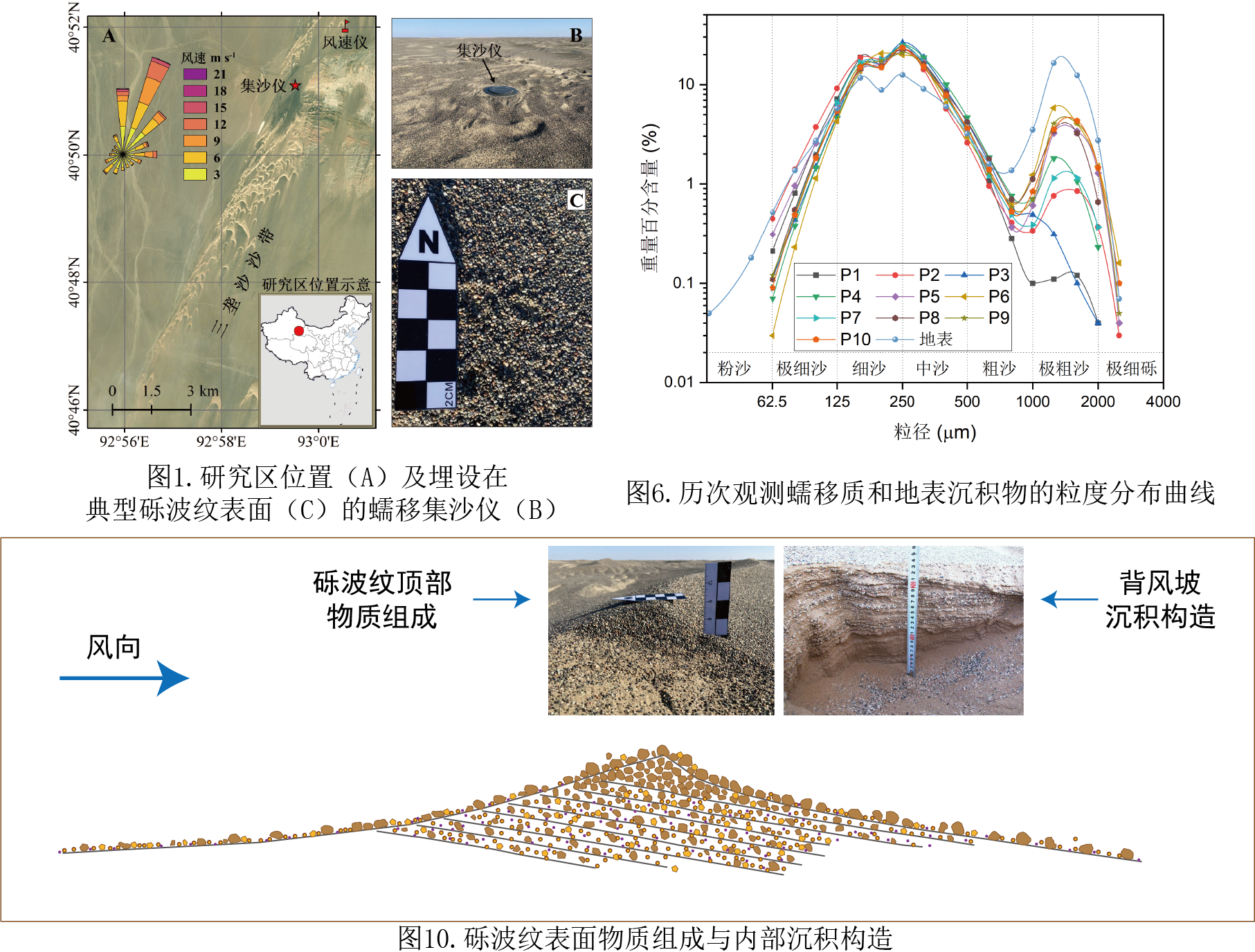 風(fēng)沙運動(dòng)指風(fēng)力作用下沙粒、粉塵或其它松散沉積物發(fā)生侵蝕、搬運和堆積的過(guò)程。這一過(guò)程在地球上干旱和半干旱地區、沿海環(huán)境以及其它有大量松散沉積物的地區尤為顯著(zhù)。從沉積物搬運過(guò)程來(lái)看,風(fēng)沙運動(dòng)可以分為蠕移、躍移和懸移三種基本形式。蠕移通常被認為是粒徑大于0.5 mm的沙礫物質(zhì)的主要搬運方式,可以占到輸沙總量的1%至50%,但由于其搬運的隱秘性及缺乏高精度的觀(guān)測設備,在風(fēng)沙運動(dòng)研究中較少受到關(guān)注。礫波紋作為一種獨特的風(fēng)沙地貌形態(tài),由雙峰型沉積物組成,表面被粗顆粒覆蓋,其形成演化與蠕移運動(dòng)密切相關(guān),但學(xué)界對其形態(tài)動(dòng)力過(guò)程認知非常有限。
