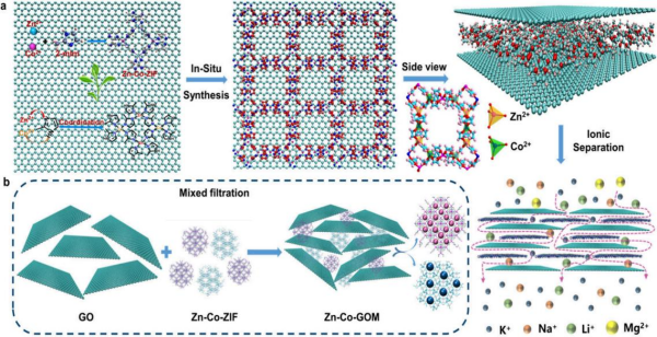 從鹽湖鹵水中獲取鋰資源是最重要的途徑之一。鹵水成分復雜,Mg2+和Li+水合離子半徑相似,鎂鋰分離難度大。膜分離技術(shù)具有節能、高效、環(huán)保、操作靈活和成本低等特點(diǎn),可通過(guò)精細調控膜的孔徑和表面化學(xué)性質(zhì),實(shí)現對特定離子的選擇性分離。但膜的穩定性、耐腐蝕性以及長(cháng)期使用后的性能衰退仍然是制約膜分離技術(shù)應用的主要問(wèn)題。針對上述問(wèn)題,青海鹽湖所鹽湖有機質(zhì)與硼鉀分離技術(shù)課題組開(kāi)發(fā)了一種新型的雙金屬有機框架(MOF)/氧化石墨烯(GO)復合膜,以提高鹽湖鋰的提取效率。