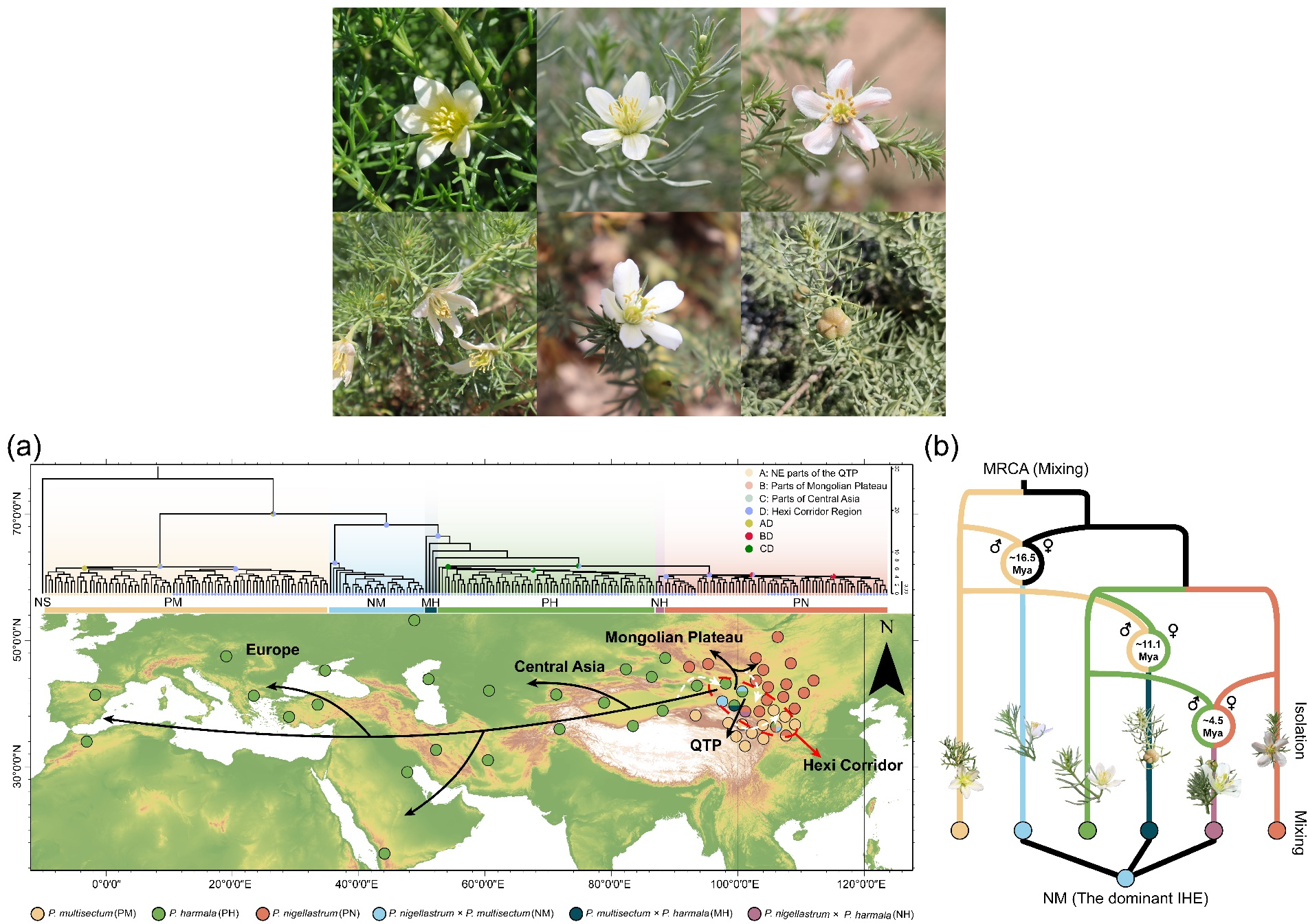 中國科學(xué)院西北高原生物研究所青藏高原植物適應與進(jìn)化研究團隊綜合利用Illumina二代測序、Oxford Nanopore三代測序及Hi-C互作圖譜技術(shù),成功構建了多裂駱駝蓬的高質(zhì)量染色體水平參考基因組(2n=2x=24,基因組大小為314.37 Mb)?;谥衼喐珊祬^及其周邊地區的廣泛采樣,本研究對駱駝蓬屬及其中間形態(tài)類(lèi)群的28個(gè)群體共284個(gè)個(gè)體進(jìn)行了全基因組重測序。研究結果表明,駱駝蓬屬起源于河西走廊地區,通過(guò)擴散作用和地理隔離形成了多裂駱駝蓬、駱駝蒿和駱駝蓬的異域物種形成。隨后,這些物種再次擴散至河西走廊地區,通過(guò)頻繁的基因交流演化出多種間斷雜交實(shí)體。本研究首次在中亞干旱區揭示了駱駝蓬屬的物種形成符合“混合-隔離-混合循環(huán)”(MIM cycles,Mixing-Isolation-Mixing cycles)的演化框架,解析了雜交物種形成的中間過(guò)渡階段。此外,研究發(fā)現,間斷雜交實(shí)體通過(guò)基因交流繼承了親本的優(yōu)良性狀(如DNA損傷修復能力和抗旱適應性),從而在自然選擇中表現出顯著(zhù)的優(yōu)勢。通過(guò)對不同物種的轉錄組測序分析,進(jìn)一步驗證了間斷雜交實(shí)體中與適應性進(jìn)化相關(guān)的基因存在顯著(zhù)差異表達。本研究通過(guò)對中亞干旱區駱駝蓬屬的系統性群體遺傳學(xué)研究,揭示了其獨特的物種形成模式,為雜交物種形成中間階段的研究提供了重要的模式類(lèi)群,并為物種與雜交種間的適應性進(jìn)化機制提供了新的理論依據。
