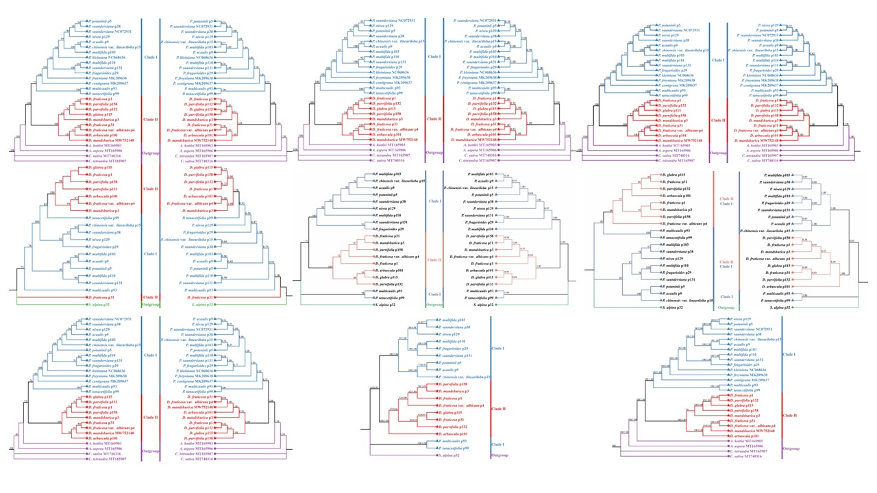 中國科學(xué)院西北高原生物研究所青藏高原植物適應與進(jìn)化研究團隊選擇了19個(gè)委陵菜屬和金露梅屬的全質(zhì)體基因組進(jìn)行Illumina二代測序,重建了該類(lèi)群的系統發(fā)育關(guān)系,并研究了他們之間的核質(zhì)沖突關(guān)系。研究結果表明,這些質(zhì)體基因組的結構、GC含量和基因組成都高度保守,包含84個(gè)CDS、37個(gè)tRNA基因和8個(gè)rRNA基因。此外,所有金露梅屬質(zhì)體基因組的rpl2失去了唯一的內含子。比較基因組分析結果表明,質(zhì)體大小的差異歸因于LSC區、SSC區和IRS區的長(cháng)度差異,并且IR區大部分是保守的,非編碼區比編碼區具有更高的差異性。我們篩選了SSR,發(fā)現了7個(gè)高度可變位點(diǎn),可作為潛在的分子標記,在闡明委陵菜屬和金露梅屬的屬間關(guān)系上具有一定的參考意義。通過(guò)核基因(ITS、ETS)和細胞質(zhì)基因(質(zhì)體、線(xiàn)粒體)構建的系統發(fā)育樹(shù),確定了委陵菜屬和金露梅屬的單系性。我們在委陵菜屬中檢測到了核質(zhì)沖突,這種沖突往往會(huì )導致其單系性發(fā)生變化,我們推測可能在其進(jìn)化過(guò)程中發(fā)生了一定程度的種間雜交或不完整譜系分選事件。本研究通過(guò)對委陵菜屬和金露梅屬的系統發(fā)育比較分析,為該類(lèi)群之間的分類(lèi)學(xué)研究奠定基礎。