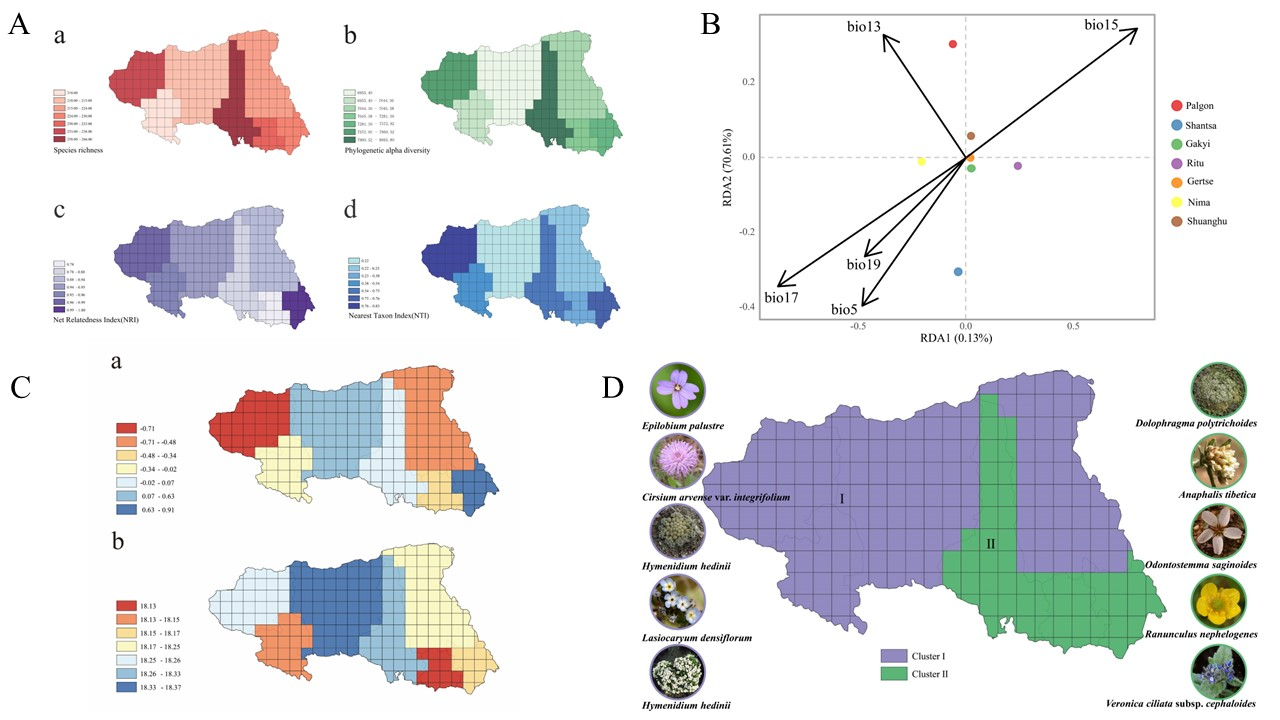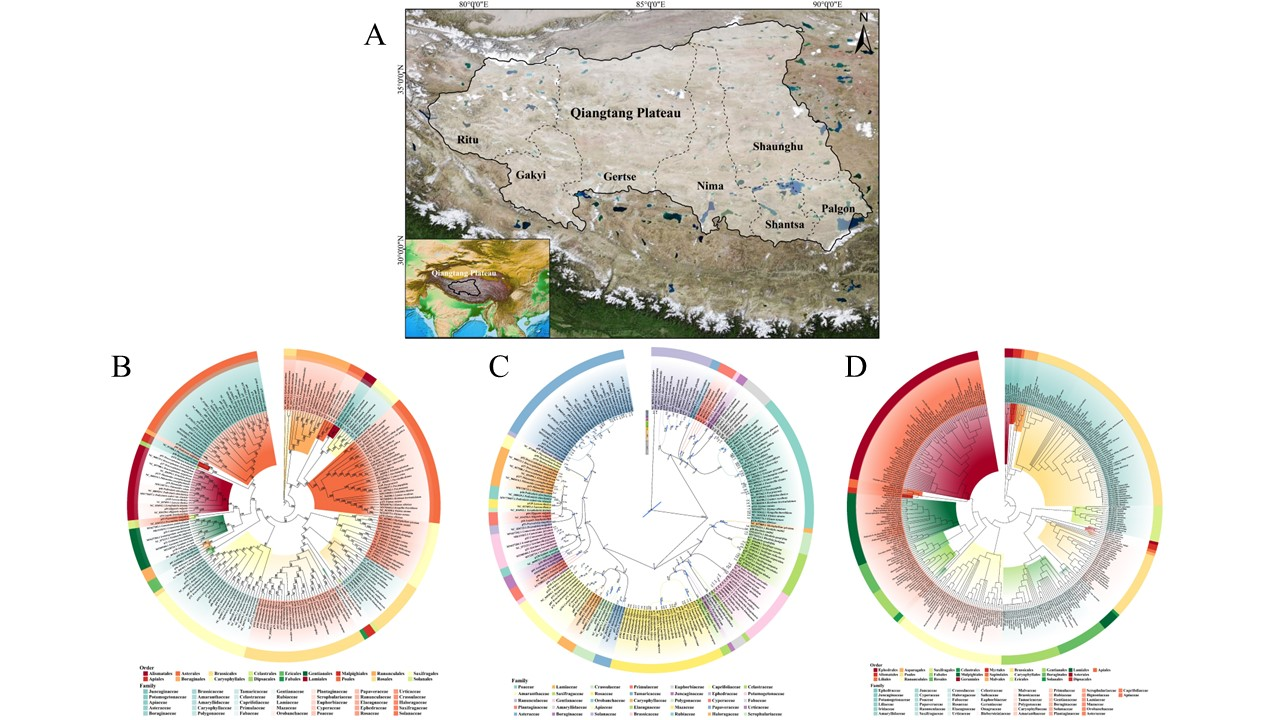 系統發(fā)育區系學(xué)通過(guò)將系統發(fā)育信息整合到植物區系分析中,推斷區系內物種的分化時(shí)間,從而更好地反映不同區域物種分布及組合的動(dòng)態(tài)歷史過(guò)程,揭示區系的起源及演化歷史。羌塘高原位于青藏高原腹地,是“世界屋脊的屋脊”,因其獨特且完整的高寒生態(tài)系統以及眾多珍稀瀕危物種成為研究青藏高原乃至世界高寒干旱植物區系起源及演化歷史的天然實(shí)驗室。本研究基于傳統植物區系學(xué)和系統發(fā)育區系學(xué)的方法,對羌塘高原種子植物開(kāi)展區系研究,重建了370種植物的系統發(fā)育關(guān)系,對研究區內各縣域網(wǎng)格單元進(jìn)行系統發(fā)育多樣性分析,并結合平均分化時(shí)間和物種分歧時(shí)間,探討羌塘高原植物多樣性格局及其形成機制。