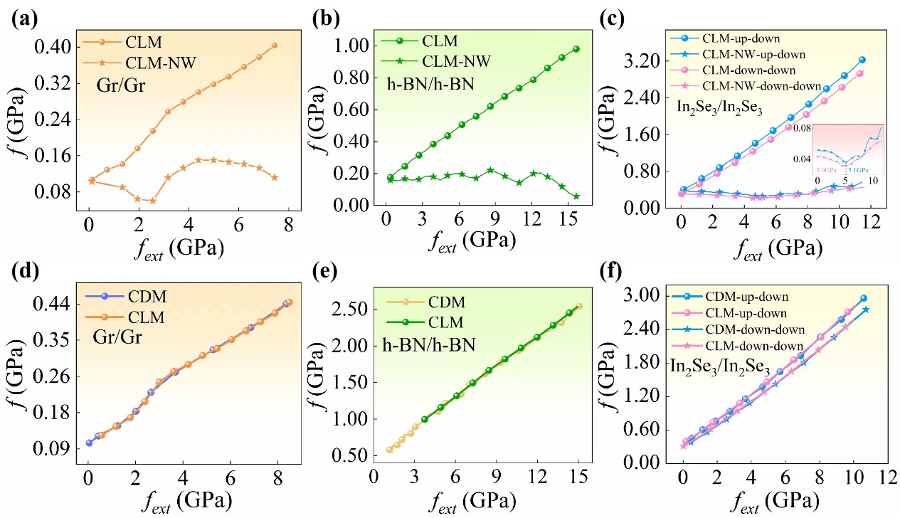 近日,中國科學(xué)院蘭州化學(xué)物理研究所潤滑材料全國重點(diǎn)實(shí)驗室計算摩擦學(xué)課題組與蘭州交通大學(xué)材料科學(xué)與工程學(xué)院等單位合作,使用自主搭建的固體界面摩擦性能第一性原理高通量計算平臺LICP-FPHTC-Platform ( 摩擦學(xué)學(xué)報42(2022)493;軟件著(zhù)作權2021SR1172689),考慮目前主流的三種靜態(tài)摩擦性能計算模型——等距模型(CDM)、等載模型(CLM)、無(wú)負載做功的等載模型(CLM-NW),針對已報道了負摩擦系數的二維材料界面體系——Gr/Gr、h-BN/h-BN、In2Se3/In2Se3,研究了摩擦性能的計算結果對計算模型的依賴(lài)。結果表明,只有CLM-NW的計算模型出現了文獻報道的負摩擦系數現象,CDM和CLM的摩擦計算結果定量一致(圖1)。