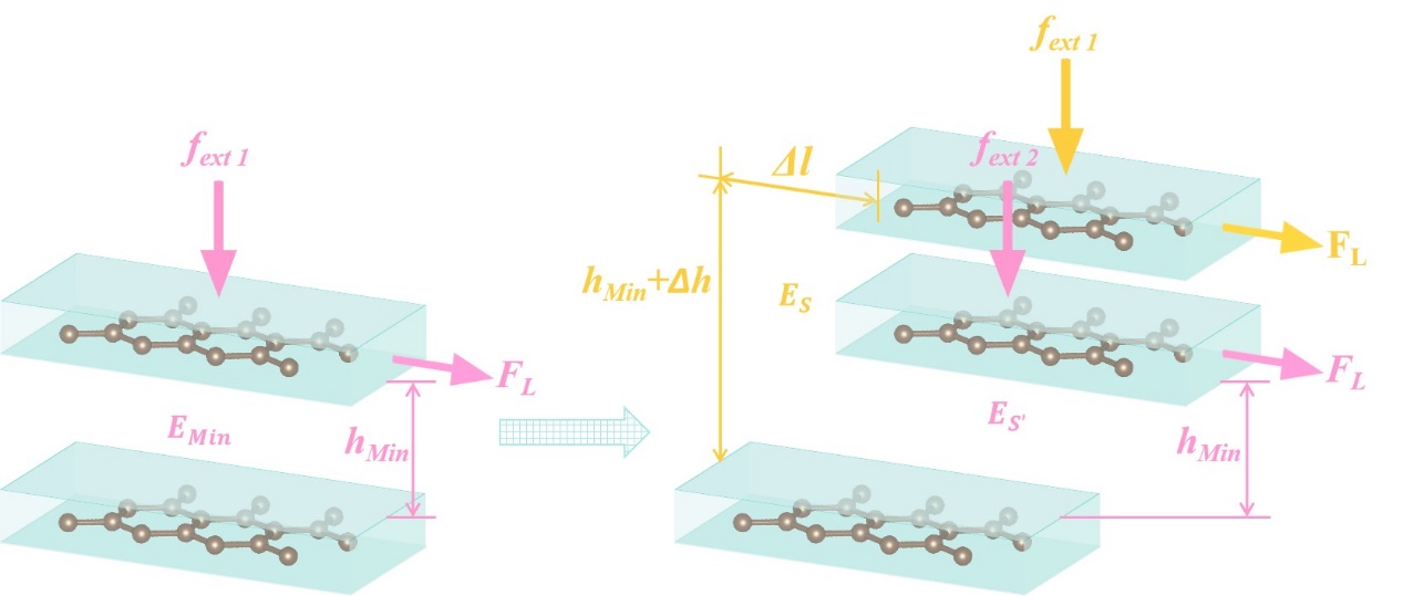 圖2 等載和等距滑動(dòng)過(guò)程中界面受力示意圖?;瑒?dòng)過(guò)程中的能量最小點(diǎn)(左)和鞍點(diǎn)(右)。黃色和粉色標記分別表示等載和等距滑動(dòng)過(guò)程的界面信息