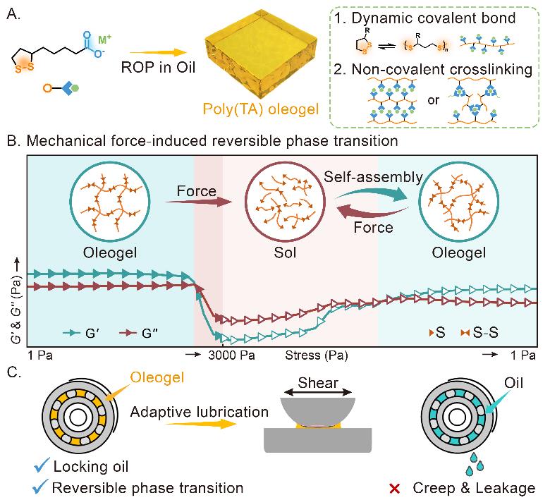 針對傳統潤滑油脂在新型高端裝備應用中面臨爬移、泄漏、粘滯阻力高等難以應對復雜多變工況的問(wèn)題。近日,中國科學(xué)院蘭州化學(xué)物理研究所潤滑材料全國重點(diǎn)實(shí)驗室材料表面與界面研究組通過(guò)構筑具有機械力響應特性的動(dòng)態(tài)共價(jià)網(wǎng)絡(luò ),開(kāi)發(fā)了一類(lèi)具有力誘導可逆相轉變能力的自適應油凝膠潤滑材料(PTA油凝膠)。PTA油凝膠可適應設備啟停,在溶膠或凝膠狀態(tài)保持和迅速轉換,且具有出色的潤滑穩定性、適應不斷變化的運動(dòng)工況。