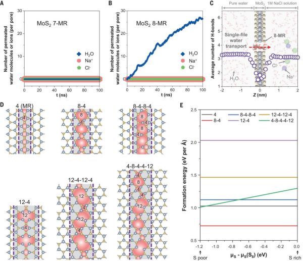 研究團隊結合分子動(dòng)力學(xué)模擬和密度泛函理論計算,揭示了單層MoS?晶界處形成的八元環(huán)(8-MR)孔結構的尺寸篩分效應,該孔徑能夠允許單鏈水分子快速通過(guò),同時(shí)完全阻止水合離子(如Na?和Cl?)的通過(guò)。因此,單層MoS?晶界處形成的八元環(huán)(8-MR)孔結構可以作為分子篩,有效分離水和離子。實(shí)驗過(guò)程中,研究團隊通過(guò)精確控制MoS?晶粒的生長(cháng)方向(固定0°或60°的相對取向),成功在大面積單層MoS?膜中實(shí)現了豐富的8-MR孔結構。通過(guò)進(jìn)一步調節晶粒生長(cháng)時(shí)間、硫蒸氣壓力等參數,實(shí)現了對晶粒尺寸和晶界密度的精確調控。優(yōu)化后的MoS?膜在多種測試條件下展現出優(yōu)異的性能,如高水滲透性、高離子選擇性以及良好的機械和化學(xué)穩定性。這使得其在海水淡化、污水處理等領(lǐng)域具有廣闊的應用前景,為二維材料在分離膜領(lǐng)域的應用提供了新的思路。該方法不僅能夠精確控制孔結構,還能實(shí)現大面積連續膜的制備,具有重要的實(shí)際應用價(jià)值。