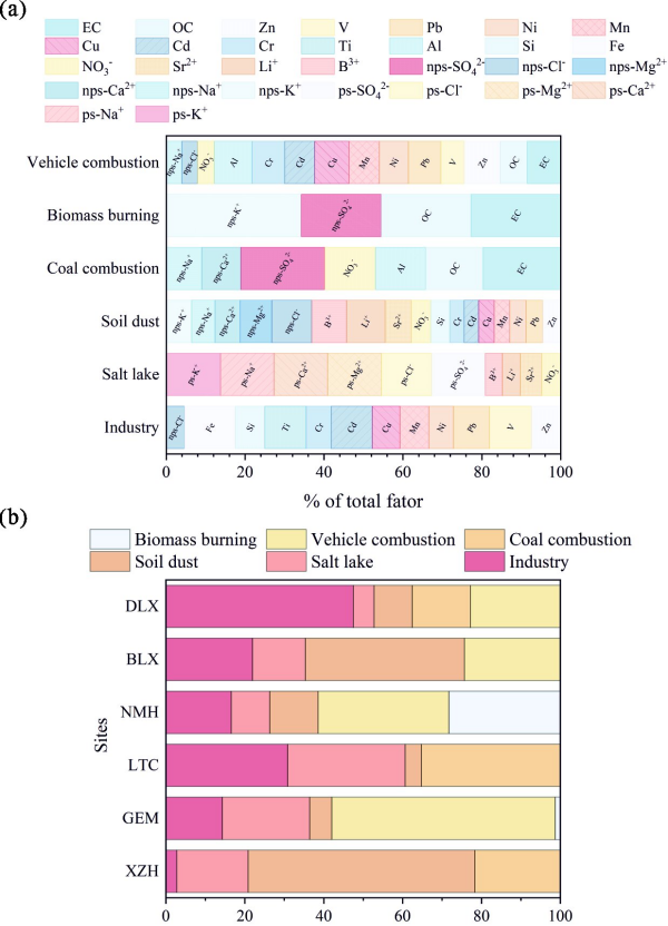 研究表明,柴達木盆地大氣降塵中石鹽和石膏的含量范圍為 0 至 47 wt%,鹽塵沉積通量(SDF)在 0 至 2.54 g/m2·30d 之間變化,其主要可溶性離子包括nps-SO42?、ps-Cl??和ps-Na+。不同采樣點(diǎn)的ps和nps組分的分布趨勢與可溶性離子相似,ps-Na+和ps-Cl–占比分別為49.52±34.59%和58.14±40.02%,表明鹽湖排放顯著(zhù)影響降塵成分。源解析結果顯示,鹽湖排放貢獻了降塵來(lái)源的 5.23% ~ 29.76%,顯示了鹽湖來(lái)源的粉塵對大氣降塵具有不可忽視的重要貢獻。