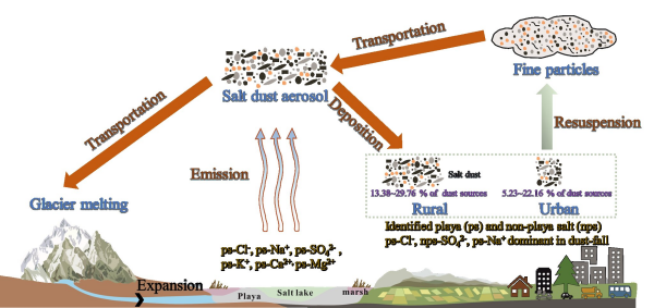 研究表明,鹽塵可能是內陸地區Na?和Cl?離子的重要來(lái)源,尤其是在春季和冬季,西北風(fēng)將大量鹽塵輸送到下游地區,甚至影響到東亞和更廣泛區域的空氣質(zhì)量。此外,鹽塵的排放可能形成一個(gè)區域正反饋循環(huán):鹽塵加劇了冰川的消融,冰川融化則增加了河流徑流量,進(jìn)而擴大了鹽湖及周邊鹽漬土的范圍,從而導致更多的鹽塵釋放到大氣中并進(jìn)一步加速冰川融化。這一認識對全球生態(tài)安全和水資源管理具有重要啟示意義。這項研究系統評估了鹽塵排放對大氣顆粒物沉積的貢獻,揭示了鹽塵在區域及全球氣候環(huán)境變化中的潛在作用。根據本研究結果,建議在全球變暖背景下,未來(lái)制訂環(huán)境政策和構建氣候模型時(shí)需要更多地關(guān)注內陸鹽湖粉塵的影響。