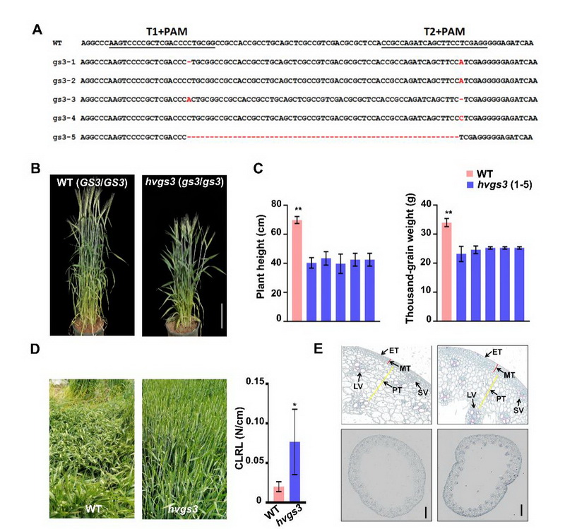 Gγ亞基在多種生物過(guò)程中發(fā)揮著(zhù)重要作用,但其在大麥中的具體功能尚未完全明確。為了深入研究這一問(wèn)題,中國科學(xué)院西北高原生物研究所高原作物種質(zhì)資源創(chuàng )新與利用研究團隊利用CRISPR/Cas9技術(shù)敲除大麥品種Golden Promise中的HvGS3基因,并通過(guò)詳細的表型分析比較了突變體hvgs3與野生型之間的株高、穗長(cháng)和千粒重等農藝性狀。結果顯示,突變體hvgs3的株高比野生型降低了37.8%至43.1%,同時(shí)倒二節的抗倒伏指數提高了76.6%。進(jìn)一步分析發(fā)現,突變體hvgs3的莖節細胞長(cháng)度顯著(zhù)縮短,導致株高降低。突變體hvgs3的木質(zhì)素合成通路被激活,木質(zhì)素含量比野生型增加了22%,基部第二節間的維管束數量、機械組織厚度均高于野生型,從而增強了莖稈的機械強度。通過(guò)CRISPR/Cas9技術(shù)成功敲除HvGS3基因,我們創(chuàng )制了一種具有矮化和抗倒伏特性的大麥新種質(zhì)資源,株高的降低和莖稈強度的增加共同提升了其抗倒伏性能。該研究不僅揭示了大麥HvGS3基因的功能,還為培育抗倒伏、高產(chǎn)的大麥品種提供了寶貴的理論依據和技術(shù)支持。