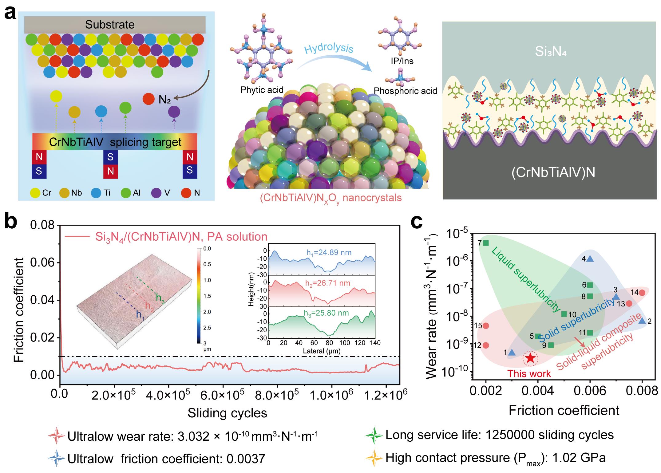 雖然水基超潤滑材料具有諸多優(yōu)勢,但其對金屬摩擦副的腐蝕問(wèn)題會(huì )影響超潤滑狀態(tài)的長(cháng)期穩定性。為此,中國科學(xué)院蘭州化學(xué)物理研究所潤滑材料全國實(shí)驗室研究團隊近期提出了一種基于摩擦催化效應的“固-液復合超潤滑”策略,基于天然有機酸植酸和高熵陶瓷涂層的協(xié)同作用實(shí)現了優(yōu)異的減摩抗磨性能,有效地避免了水基潤滑劑的腐蝕問(wèn)題。通過(guò)磁控濺射技術(shù)在軸承鋼表面沉積了(CrNbTiAlV)N高熵陶瓷薄膜(圖1),表現出優(yōu)異的力學(xué)性能并提供了豐富的反應位點(diǎn)。此外,在摩擦過(guò)程中高熵陶瓷表面還形成了一層鈍化層,可有效防止水基潤滑劑對鋼基體的腐蝕。