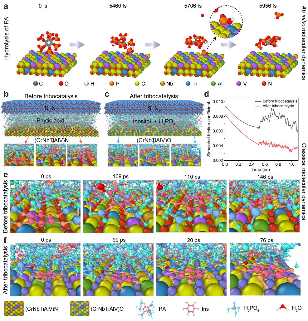 經(jīng)測試,該固-液復合超潤滑體系可在125萬(wàn)次往復摩擦循環(huán)中持續保持超潤滑狀態(tài),摩擦系數低至0.0037,磨損率約為3.032×10?10mm3/(N·m)。摩擦過(guò)程中原位形成了平均粒徑約為7.3nm的高熵陶瓷納米晶體,這些納米晶體促進(jìn)了植酸分子的水解,生成了肌醇多磷酸(或肌醇)和磷酸分子。通過(guò)分子動(dòng)力學(xué)模擬進(jìn)一步證明,肌醇和磷酸在滑動(dòng)過(guò)程中可有效降低摩擦阻力,從而在宏觀(guān)尺度上實(shí)現固-液復合超潤滑(圖2)。該研究證實(shí)了摩擦催化效應在超潤滑中的作用,為設計高性能固-液復合超潤滑系統提供了新策略。