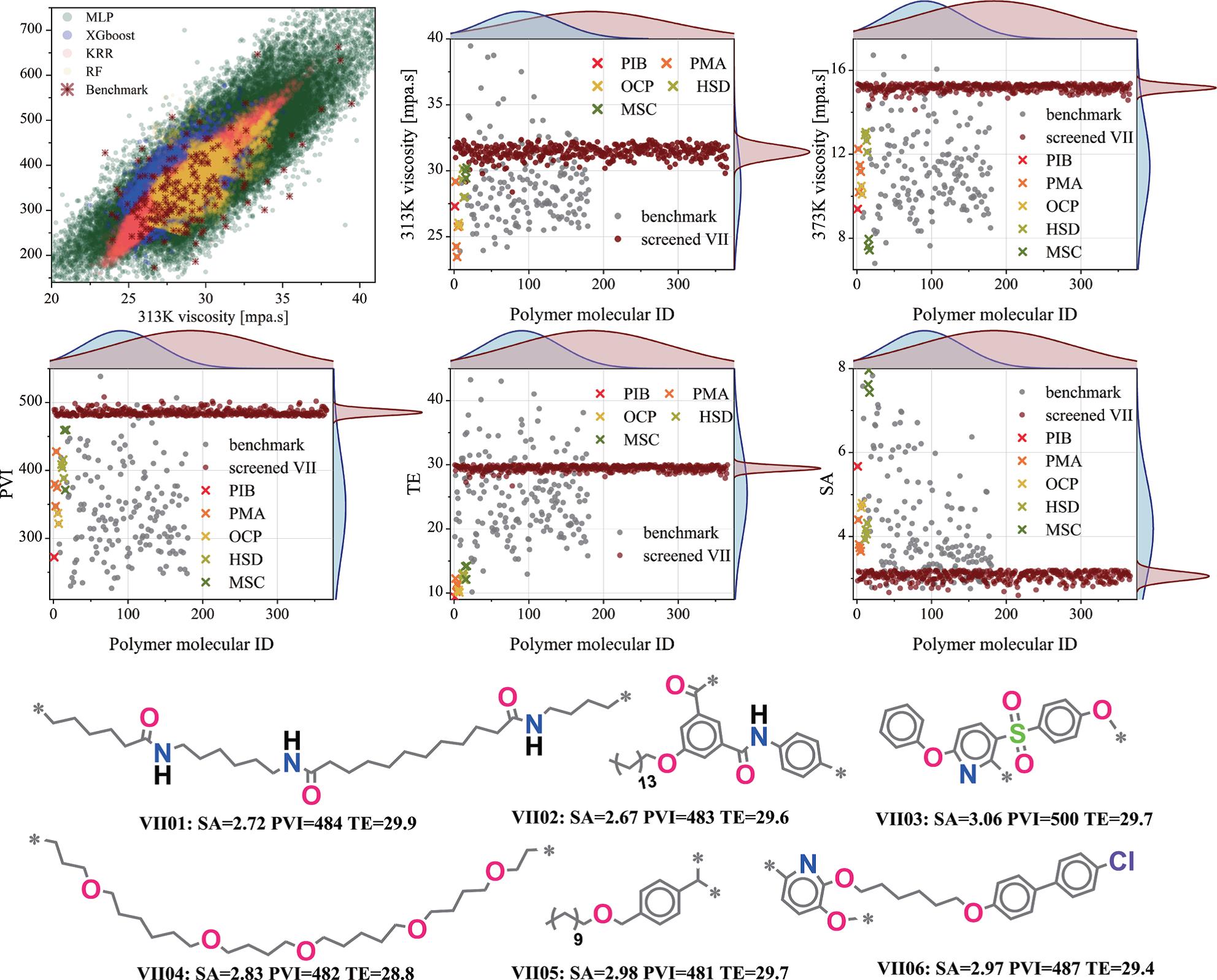 中國科學(xué)院蘭州化學(xué)物理研究所潤滑材料全國重點(diǎn)實(shí)驗室材料表面界面團隊長(cháng)期致力于潤滑油材料的分子模擬工程和人工智能設計研究。近期,研究人員融合高通量分子動(dòng)力學(xué)模擬與可解釋人工智能的自動(dòng)化材料設計框架,破解了潤滑油核心添加劑——黏度指數改進(jìn)劑(VII)研發(fā)難題。該研究通過(guò)自主開(kāi)發(fā)的智能計算管道,僅從5類(lèi)商用聚合物出發(fā),高效生成大規模VII數據集(1166組數據),并利用多目標機器學(xué)習模型從180萬(wàn)候選分子中篩選出366種高性能聚合物,其粘溫性能超越現有商用產(chǎn)品。該工作有望為潤滑油行業(yè)節省大量實(shí)驗成本,驗證數據稀缺領(lǐng)域“計算驅動(dòng)-模型解析-材料設計”的研發(fā)新范式,在高分子材料、藥物設計等領(lǐng)域具有廣泛推廣價(jià)值。
