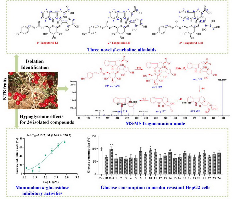中國科學(xué)院西北高原生物研究所藏藥研究重點(diǎn)實(shí)驗室對唐古特白刺果實(shí)化學(xué)成分進(jìn)行了系統的分離純化,從中鑒定了三種新的香豆酰葡萄糖苷衍生β-咔啉類(lèi)生物堿tangutorid LI-III。首次揭示了該類(lèi)成分的MS/MS裂解規律,為該類(lèi)成分的快速鑒定提供了理論依據。另外,根據分離得到的化合物結構類(lèi)型,對該類(lèi)成分在體內的生源途徑進(jìn)行了合理的推導,并推測他們是在果實(shí)中酸性條件下以植物體內含有的色氨酸,葡萄糖和咖啡酸為前體通過(guò)一系列反應合成得到。分離得到化合物降血糖活性研究首次證實(shí),depsides和環(huán)肽(cyclo(tyr-tyr)具有顯著(zhù)的IR改善作用。本研究豐富了果實(shí)中β-咔啉類(lèi)生物堿的結構類(lèi)型,擴大了環(huán)肽和depsides的生物活性,為唐古特白刺的高值開(kāi)發(fā)利用提供了堅實(shí)的數據支持和科學(xué)依據。