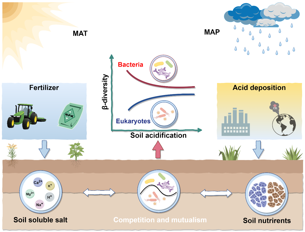 研究進(jìn)一步發(fā)現,隨著(zhù)土壤酸化程度加深,細菌-真核生物的資源競爭加劇,優(yōu)勢菌群及群落組成發(fā)生重構。鑒于氣候變化及人為因素導致的土壤酸化持續加劇,可能導致細菌與真核生物進(jìn)一步解耦,削弱兩者功能協(xié)同性,威脅陸地生態(tài)系統穩定性。未來(lái)應建立基于土壤pH值動(dòng)態(tài)的微生物多樣性預警體系,并將跨生態(tài)系統微生物互作機制納入全球變化模型,從而更精準地預測陸地生態(tài)系統的響應。
