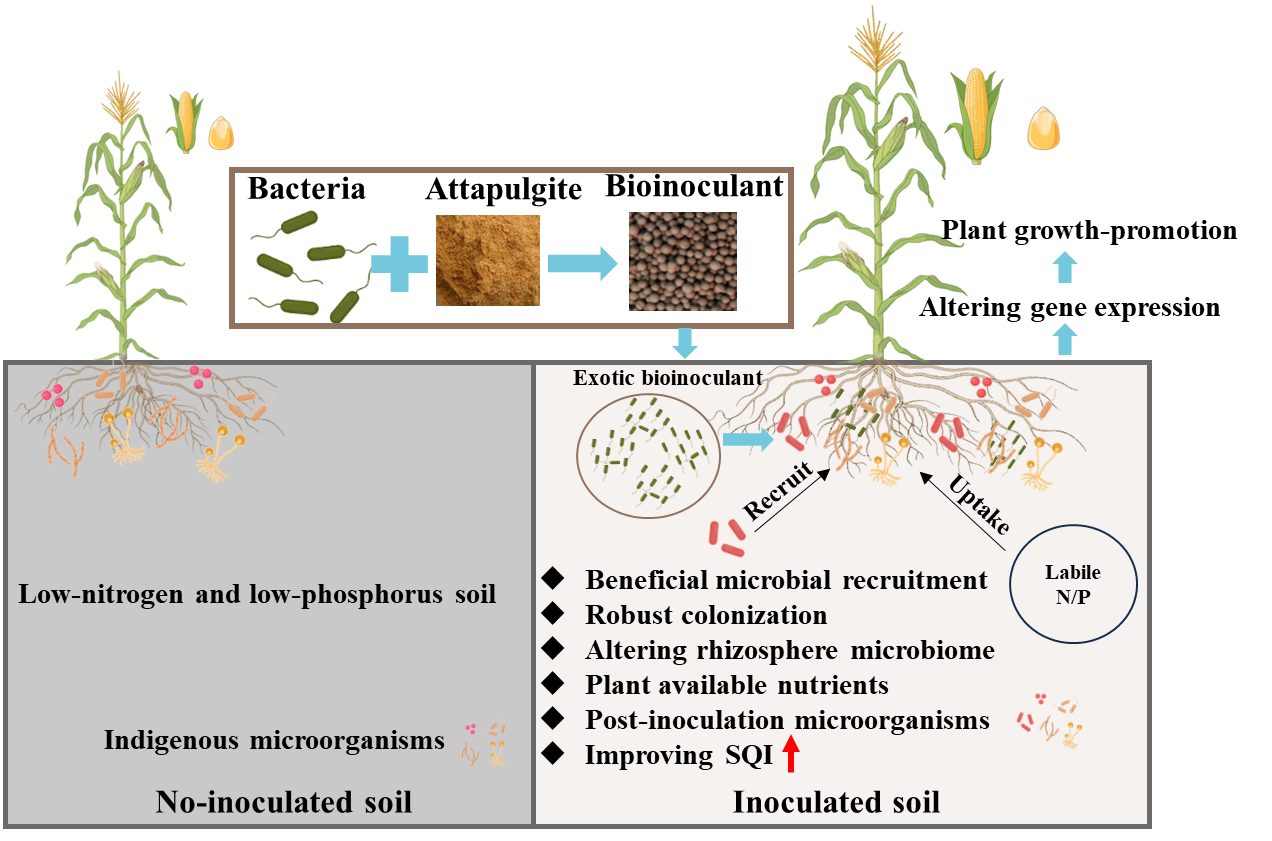 中國科學(xué)院西北生態(tài)環(huán)境資源研究院王若愚研究員團隊與奧地利國家技術(shù)研究院的Angela Sessitsch教授和Günter Brader教授合作,系統揭示了固體顆粒微生物菌劑(貝萊斯芽孢桿菌Bacillus velezensis FZB42與粘土材料組成)通過(guò)調控根際微生物群落和玉米基因應答,改善貧瘠堿性黃土質(zhì)量并促進(jìn)玉米生長(cháng)的機制。研究設置了減施氮肥與不施磷肥的處理條件,探索了微生物菌劑在低外源肥料施用下,如何提高作物對土壤養分的吸收,進(jìn)而促進(jìn)增產(chǎn)的效果。