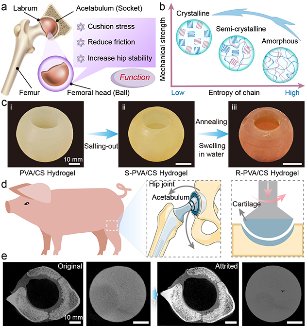 近日,團隊提出了一種低熵納米晶域網(wǎng)絡(luò )調控策略,即通過(guò)調節高熵非晶態(tài)和低熵晶態(tài)結構的比例來(lái)構建機械魯棒性的潤滑水凝膠。研究人員通過(guò)提高聚合物網(wǎng)絡(luò )中PVA大分子鏈的百分比(相對于CS的比例)來(lái)誘導PVA鏈的結晶生長(cháng),獲得了具有低熵聚合物鏈態(tài)和高結晶度的PVA/CS水凝膠,再經(jīng)水化后獲得具有高機械強度和優(yōu)異潤滑性的水凝膠材料。調控優(yōu)化的水凝膠斷裂強度為7.7~17.5 MPa、彈性模量為8.6~10.6 MPa、韌性為8.8~62.1 MJ m-3、壓痕硬度為10.4~21.7 MPa,同時(shí)該水凝膠的摩擦系數可低至0.026,且具有很好的潤滑持久性,實(shí)現了水凝膠在機械強度和潤滑性能的雙重提升,解決了傳統水凝膠在高負載條件下易破裂或變形問(wèn)題。此外,研究還展示了PVA/CS水凝膠在模擬人體承重組織中優(yōu)異的耐磨性,特別是在人工髖關(guān)節中的應用,為高性能人工關(guān)節潤滑材料的研發(fā)提供了新思路。