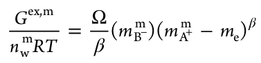 研究人員受Pierre-Gilles de Gennes聚合物標度理論[5]進(jìn)一步啟發(fā),提出“標度正規溶液理論”(即,膜相中“有效自由反離子濃度”與“表觀(guān)自由反離子濃度”間的冪律關(guān)系),用以描述溶脹離子交換膜內自由離子相互作用的超額吉布斯(Gex,m)自由能(式3):