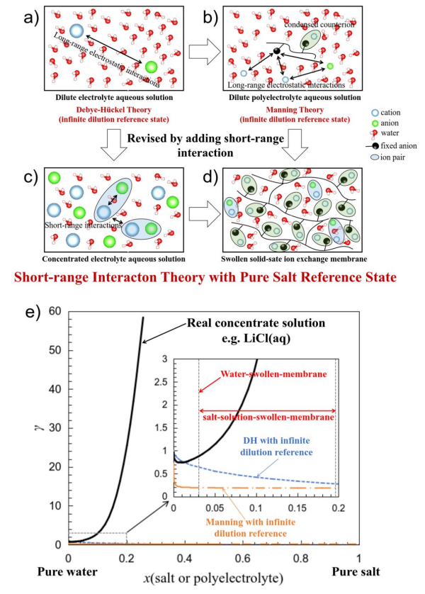 受Kenneth S. Pitzer濃電解質(zhì)溶液理論啟發(fā),研究人員認為:離子交換膜的反離子凝聚效應相較曼寧理論所描述的稀聚電解質(zhì)溶液要強的多;在純水溶脹的離子交換膜中,絕大多數的反離子處于凝聚狀態(tài),有效的屏蔽了聚合物鏈上的電荷。因此,自由離子之間的短程作用,而非長(cháng)程靜電作用,才是決定性的。這點(diǎn)與忽略長(cháng)程靜電作用的濃電解質(zhì)溶液理論完全一致。據此,研究人員創(chuàng )新性提出了"純水溶脹膜參考態(tài)"——首次明確區分了膜內反離子與溶液相中反離子的標準化學(xué)勢。