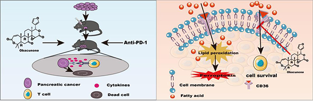 胰腺癌是一種惡性程度極高的消化系統腫瘤,五年生存率不足10%,目前缺乏有效的臨床治療措施,嚴重影響人類(lèi)生命健康。近期,研究團隊發(fā)現黃柏酮能顯著(zhù)增強抗PD-1免疫療法治療胰腺癌的效果,增加腫瘤組織中免疫標志物CD4+和CD8+T細胞的浸潤而抑制腫瘤生長(cháng),蛋白質(zhì)組學(xué)分析發(fā)現黃柏酮主要通過(guò)調控CD36介導的PPAR信號通路,抑制胰腺癌PANC-1細胞CD36表達,增加CD8+ T細胞數量,促進(jìn)胰腺癌細胞凋亡,從而抑制胰腺癌細胞生長(cháng)。相關(guān)研究成果發(fā)表在European Journal of Pharmacology(994 (2025) 177367)上。