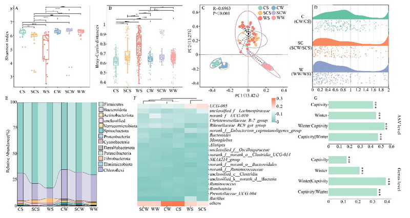 目前,腸道微生物群如何響應極端環(huán)境變化的機制仍不明確。白唇鹿(Przewalskium albirostris)是青藏高原特有的國家一級重點(diǎn)保護動(dòng)物,是研究動(dòng)物微生物群對季節變化和人類(lèi)干擾適應機制的理想模型。中國科學(xué)院西北高原生物研究所動(dòng)物生態(tài)與資源保護研究團隊,通過(guò)整合 16S rRNA 測序、宏基因組學(xué)與非靶向代謝組學(xué)等多組學(xué)方法,系統解析了白唇鹿在冬季和圈養環(huán)境下的腸道微生物組成、功能潛力及代謝特征。該研究不僅為理解高原特有動(dòng)物腸道微生態(tài)系統的動(dòng)態(tài)變化與適應策略提供了重要科學(xué)依據,也從微生物學(xué)視角為瀕危物種的保護與管理提供了理論支持。
