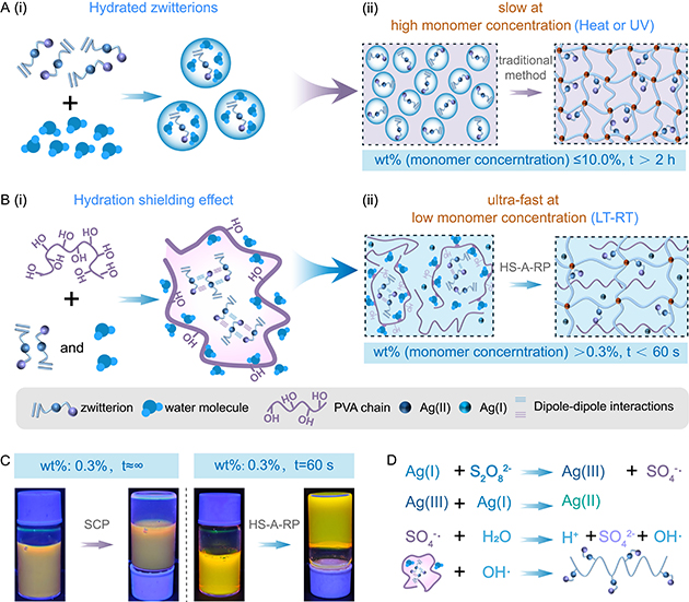 近日,中國科學(xué)院蘭州化學(xué)物理研究所潤滑材料全國重點(diǎn)實(shí)驗室材料表面與界面研究組周峰研究員團隊提出了基于一種基于“水合屏蔽”效應的聚兩性離子水凝膠制備新方法——HS-A-RP,創(chuàng )新地將PVA作為水合屏蔽劑引入Ag+-S2O82-氧化還原催化體系中,實(shí)現了通用性?xún)尚噪x子單體在寬單體濃度范圍(質(zhì)量分數:0.3-50 wt%)、寬溫域(-5℃-37℃)內的超快速聚合(t<60 秒),且反應而無(wú)需外部能量(紫外光/熱)的輸入。