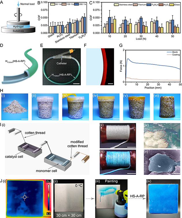 與傳統光/熱引發(fā)體系相比,HS-A-RP 制備的聚兩性離子水凝膠不僅具有更致密的網(wǎng)絡(luò )結構和更好的機械性能,還展現出了優(yōu)異的抗溶脹、潤滑、抗菌和防污性能。通過(guò)HS-A-RP方法制備的聚兩性離子水凝膠既能夠作為功能涂層有效改善生物醫用器械的表面潤滑性,又能實(shí)現對熱敏材料和砂礫的原位封裝。此外,快速凝膠化和寬溫域內可反應的特性使HS-A-RP能夠在不同基底表面和極端穩定環(huán)境條件下規?;苽渚蹆尚噪x子水凝膠涂層。該方法不僅為聚兩性離子水凝膠的化學(xué)合成提供了新途徑,還極大地拓展了其在生物醫療、工程裝備等領(lǐng)域應用領(lǐng)域。