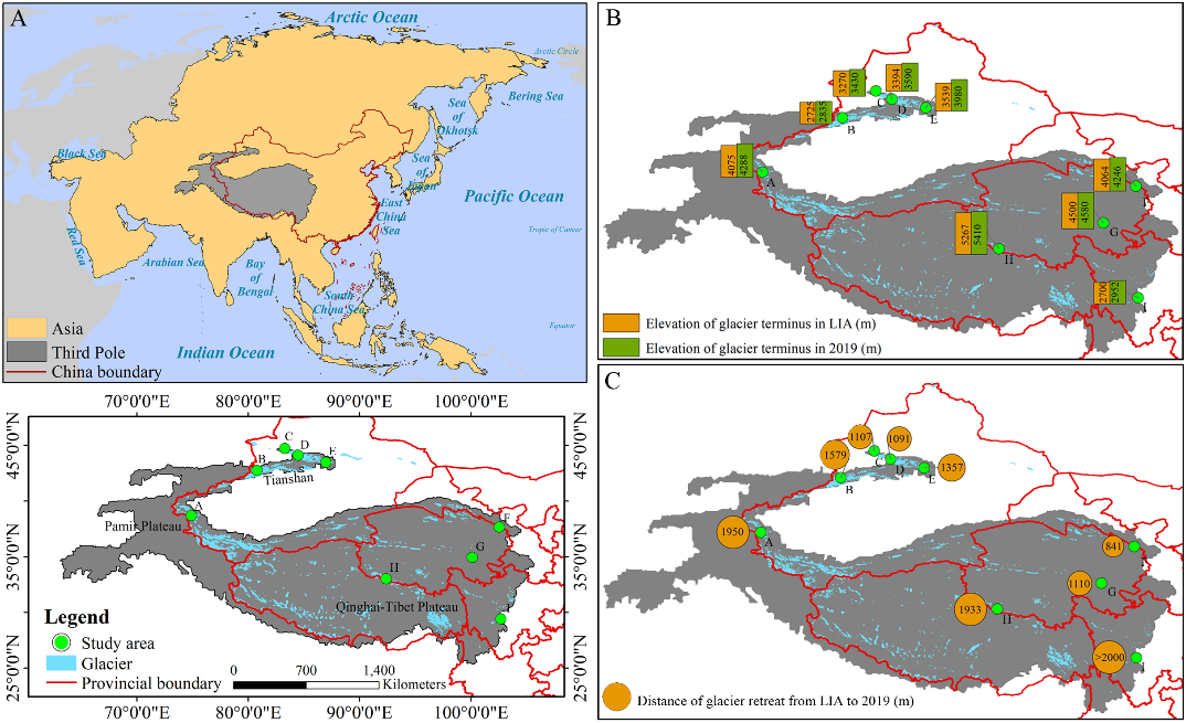 (A)研究區地理區位圖,(B)被研究冰川在小冰期和2019年的冰川末端海拔,(C)被研究冰川在小冰期至2019年間的冰川退縮距離