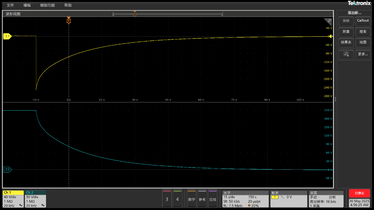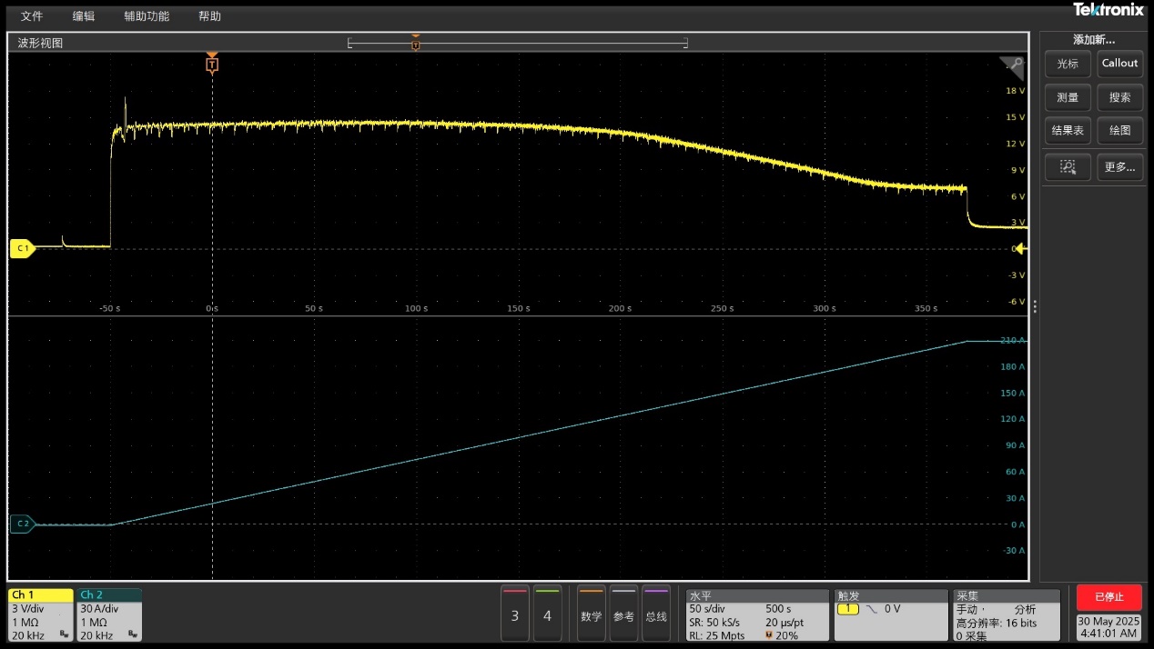 圖2 :額定電流210A勵磁時(shí)電流和電壓曲線(xiàn)