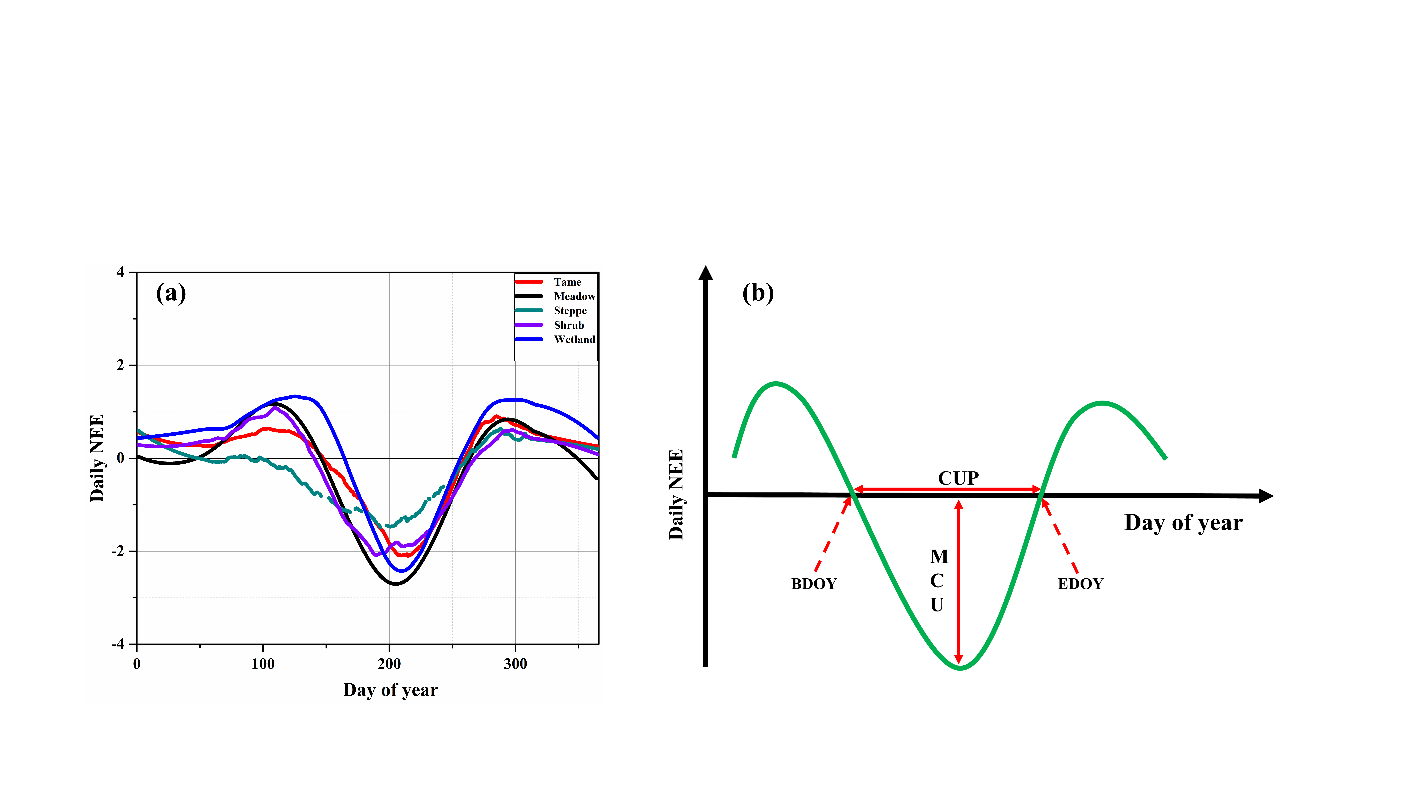 青藏高原因獨特地形被譽(yù)為地球"第三極",其 146 萬(wàn)km2的高寒草地生態(tài)系統是重要碳匯,碳同化能力的季節及年際變化受氣候因子調控。該區域草地碳固存過(guò)程分為碳吸收期與碳排放期,但兩個(gè)時(shí)期對凈生態(tài)系統碳交換(NEE)年際變異的相對貢獻一直未明確。加之青藏高原偏遠地區碳通量觀(guān)測數據匱乏且存在共享限制,不同類(lèi)型高寒草地碳吸收周期時(shí)長(cháng)、碳吸收速率及其控制因素尚不明晰,制約了對高原碳循環(huán)機制的認知。