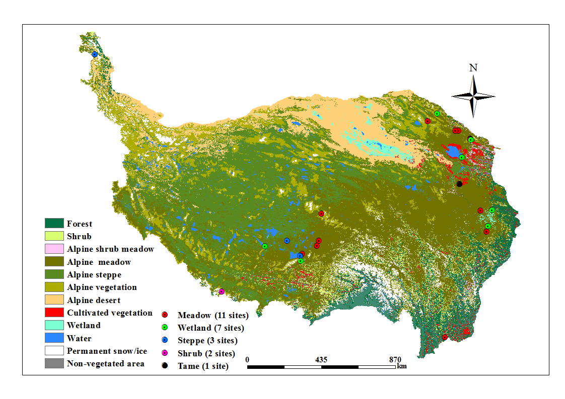圖2青藏高原 24 個(gè)渦度相關(guān)觀(guān)測站點(diǎn)的位置