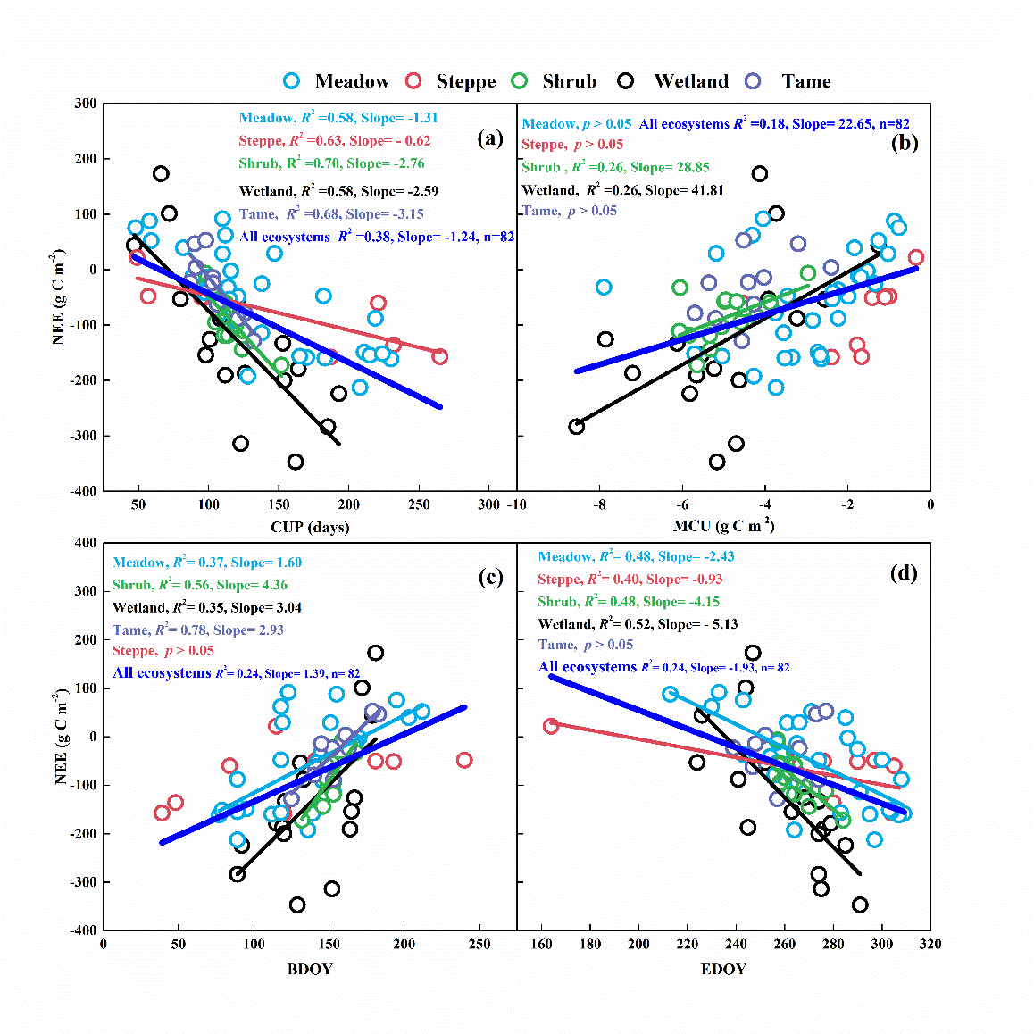 圖 3 (a) 高寒草甸、灌叢、濕地、草原及人工草地中年凈生態(tài)系統碳交換(NEE)隨凈碳吸收期(CUP)的變化;(b) 隨最大凈碳吸收速率(MCU)的變化;(c) 隨凈碳吸收起始日(BDOY)的變化;(d) 隨凈碳吸收終止日(EDOY)的變化