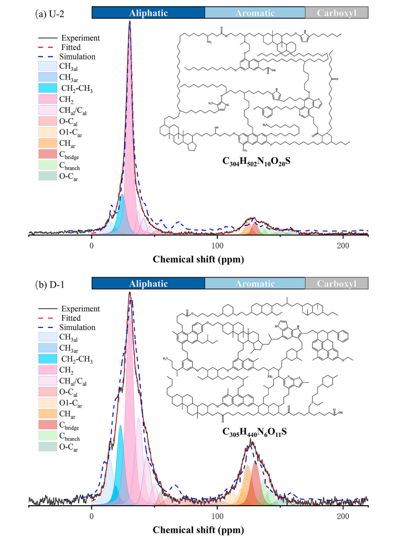 研究團隊采用多種先進(jìn)實(shí)驗技術(shù),結合分子動(dòng)力學(xué)模擬和量子化學(xué)計算,全面揭示了蘆草溝組干酪根內部不同結構單元的分布特征及其對油氣生成的調控作用。分析顯示,干酪根中的脂肪族碳主要以長(cháng)鏈線(xiàn)性亞甲基為主,部分區域富含高度支鏈和飽和環(huán)結構,芳香族碳則表現出不同程度的取代和聚合。氧、氮、硫等雜原子以多種化學(xué)態(tài)存在,尤其芳香族雜環(huán)結構對電子分布和化學(xué)反應活性影響顯著(zhù)。這些微觀(guān)結構差異使干酪根在熱裂解時(shí)表現出不同的反應傾向和產(chǎn)物特征,進(jìn)而影響油氣的組成和物理性質(zhì)。