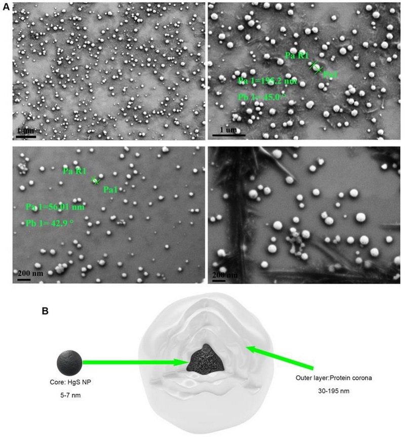 中國科學(xué)院西北高原生物研究所高原藥用資源生態(tài)保護與繁育研究團隊通過(guò)建立創(chuàng )新性金屬制劑研究體系,首次在細胞、小鼠和人體血液中證實(shí)金屬制劑能夠被生物合成為粒徑均一的HgS 納米顆粒。更重要的是通過(guò)分離純化手段首次觀(guān)察到具有完整蛋白冠的金屬納米顆粒。相對純凈完整結構的呈現不僅直觀(guān)證實(shí)了蛋白冠的存在,也為蛋白冠中蛋白質(zhì)的分析奠定了基礎。蛋白冠蛋白質(zhì)組成一直以來(lái)存在巨大分歧。本研究中通過(guò)分析HgS納米顆粒蛋白質(zhì)組成,證實(shí)金屬納米顆粒蛋白冠中蛋白質(zhì)類(lèi)型多樣,初步排除了蛋白冠僅由血清白蛋白組成的相關(guān)報道。